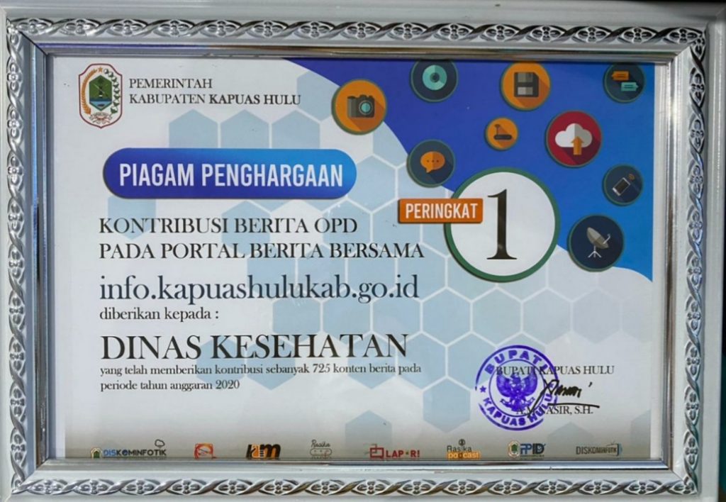 Mampu menyumbang 725 berita sepanjang tahun 2020, Dinas Kesehatan (Dinkes) Kabupaten Kapuas Hulu berhasil meraih peringkat 1 kontribusi berita OPD (Organisasi Perangkat Daerah) pada portal berita bersama info.kapuashulukab.go.id. Piagam.