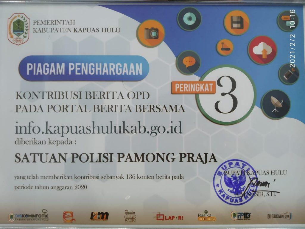 Pemerintah Kabupaten Kapuas Hulu dalam hal ini Dinas Komunikasi dan Informatika memberikan penghargaan berupa piagam kepada 6 OPD Kategori Kontribusi Berita OPD Terbanyak di portal berita bersama info.kapuashulukab.go.id. Penghargaan tersebut.