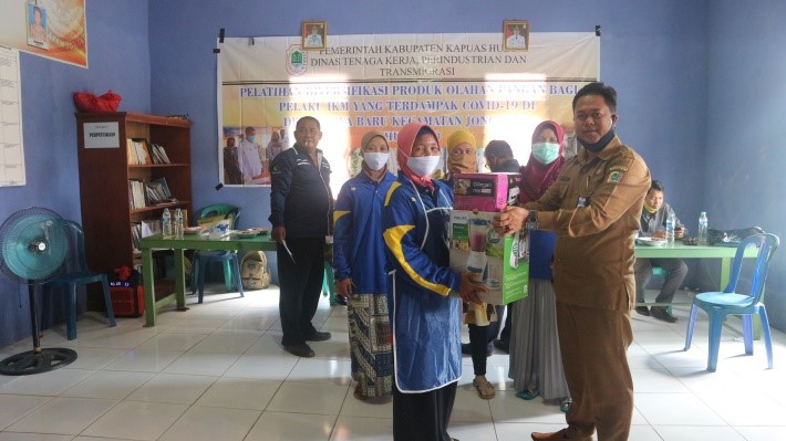 Terkait dengan pelatihan diversifikasi produk olahan pangan yang telah dilaksanakan, Disnakerintrans Kabupaten Kapuas Hulu menyerahkan bantuan peralatan untuk para pelaku IKM di Desa Karya Baru Kecamatan Jongkong yang menjadi peserta.