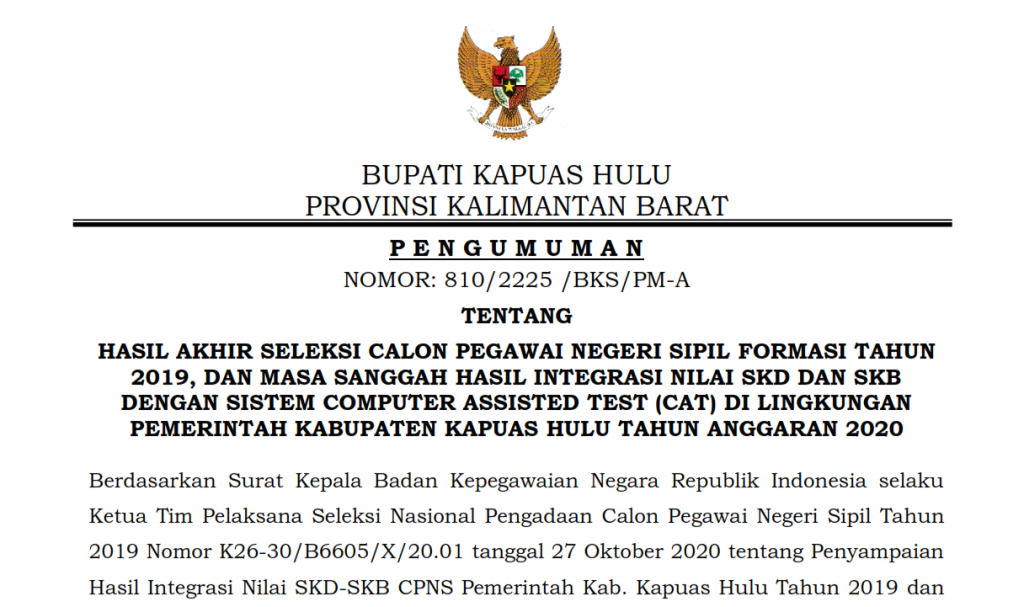 Pemerintah Kabupaten Kapuas Hulu melalui Badan Kepegawaian dan Pengembangan Sumber Daya Manusia resmi menerbitkan Pengumuman Hasil Akhir Seleksi Calon Pegawai Negeri Sipil Formasi Tahun 2019, Dan Masa Sanggah Hasil Integrasi Nilai SKD Dan SKB.