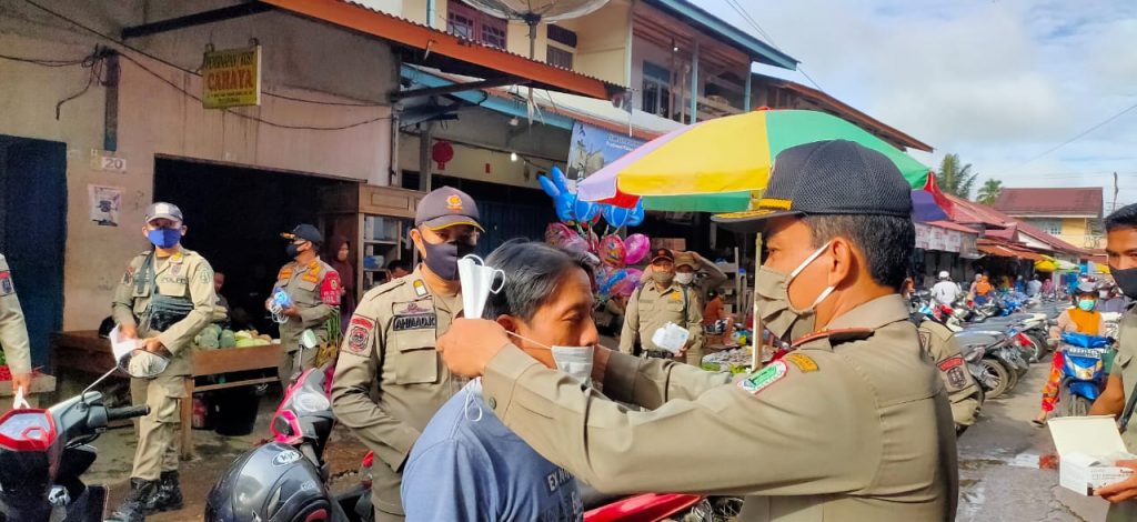 Satuan Polisi Pamong Praja (Satpol PP) kabupaten Kapuas Hulu, Kalimantan Barat melakukan pembagian masker dan mensosialisasikan protokol kesehatan kepada masyarakat di kawasan Pasar Pagi, kecamatan Putussibau Utara, Kapuas Hulu, Jumat.