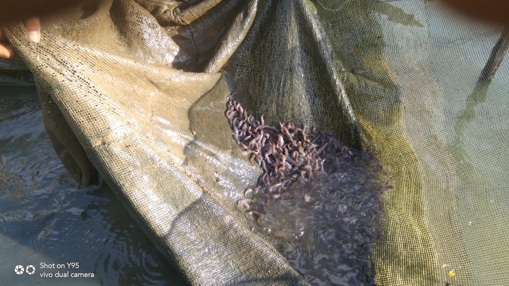 Kepala Dinas Perikanan Roni Januardi,S.Sos.,M.Si bersama Kepala Dinas Perikanan beserta Camat Kalis, Polsek, Koramil dan juga Kepala Desa Nanga Kalis tebar benih ikan lele Kamis (24/2/2021). Sebanyak 5.000 ekor benih ikan lele ditebar di dua lokasi.